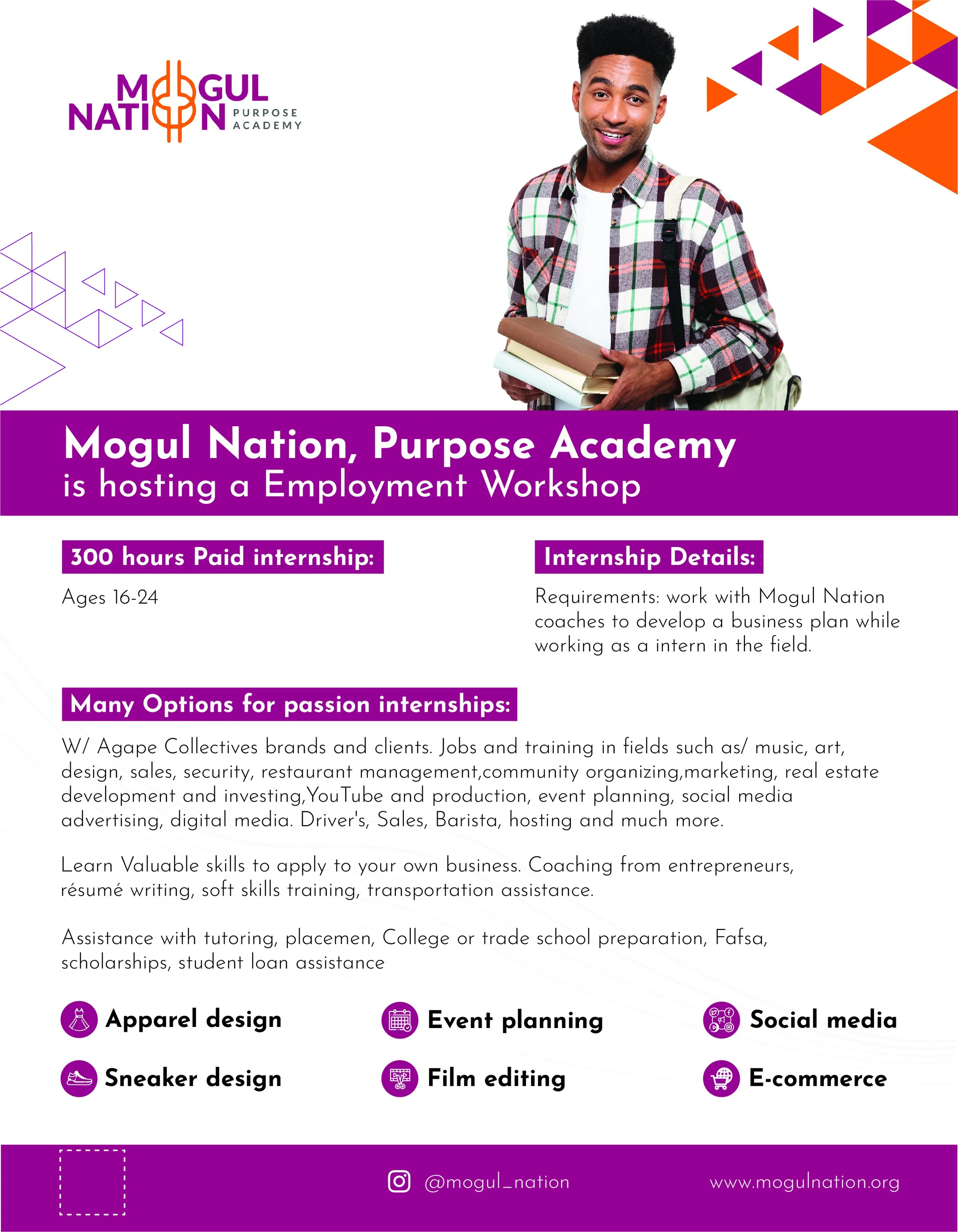 Mogul Nation interns are a select group of students 17-24 years of age with as passion, purpose, and dedication to building the knowledge to succeed in their field. Select Moguls will be offered a paid internship with Agape Collective to assist in marketing and business development for leading brands, organizations and start up companies.